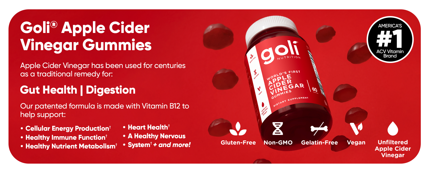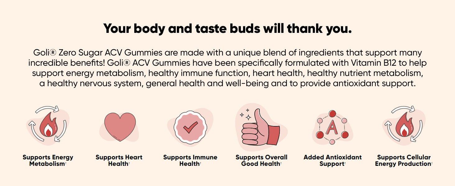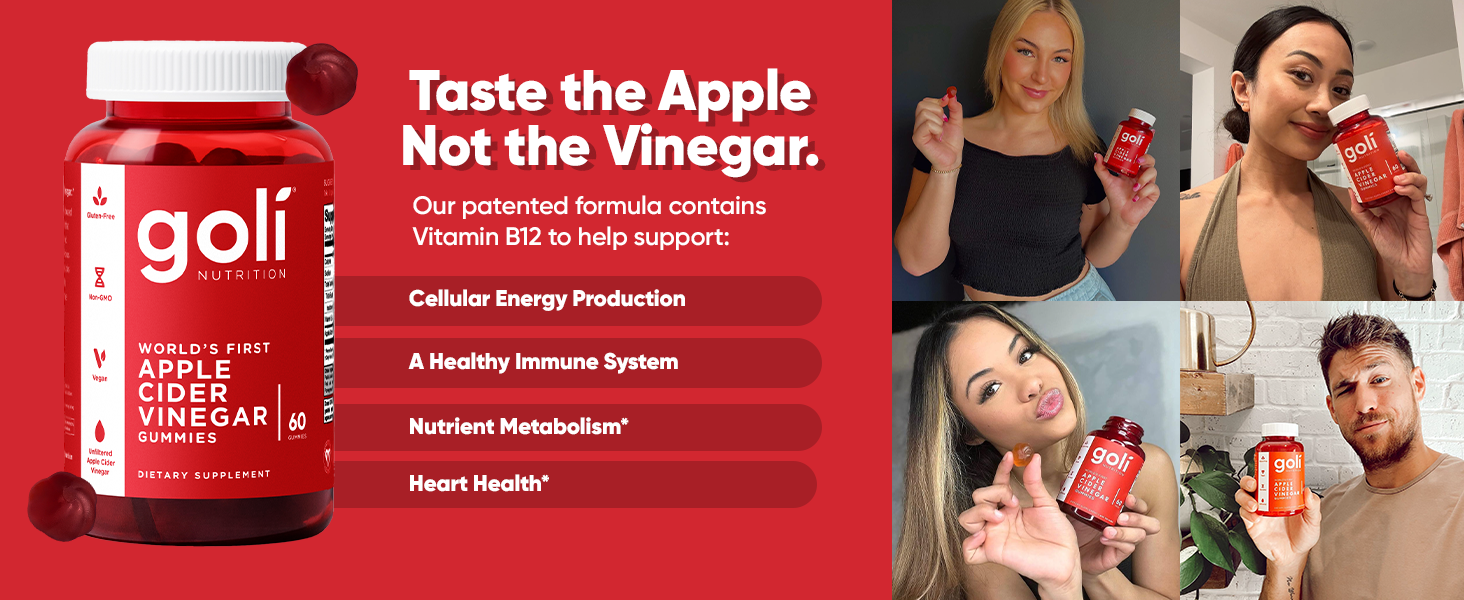 Our patented formula includes essential Vitamin B12 to support cellular energy, immune function, heart health, nutrient metabolism, a healthy nervous system, and overall health and well-being. Traditionally, Apple Cider Vinegar supports digestion, gut health, and appetite. Our unique flavor profile paired with essential vitamins makes Goli ACV Gummies a delightful addition to your daily health regimen.