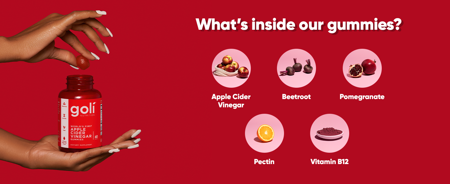 Each bottle of Goli contains 60 delicious, vegan, non-GMO, gluten-free and gelatin-free Apple Cider Vinegar gummies, suitable for all lifestyles.